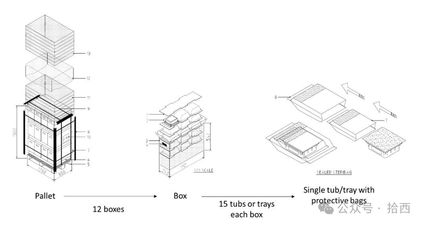图 5从箱子到单个巢盒或托盘(由袋子保护)的工作流程步骤