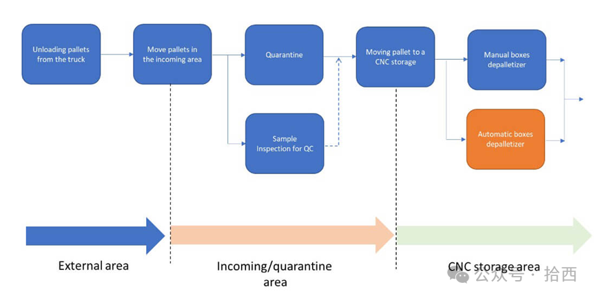 图 2中的流程图展示了从交付到卸垛的各个步骤。起点是托盘抵达生产现场的外部卸货区,垛托盘上载有规定数量的巢盒,数量符合供应商的规格要求,如果适用,也包括客户的要求。