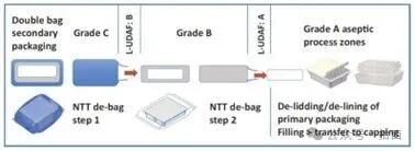 NTT 系统的主要要求是保持初级包装的无菌性。开封(剥离覆膜)巢盒或托盘必须在 A 级环境中进行,内袋的无菌性对于避免污染至关重要。单袋、双袋或真空密封(这对 NTT构成挑战)等包装类型可能会影响自动化系统的设计和性能。虽然自动化可以提高无菌保证,但也增加了生产线布局的复杂性。RTU供应商负责确保包装(包括内袋)的无菌性。
