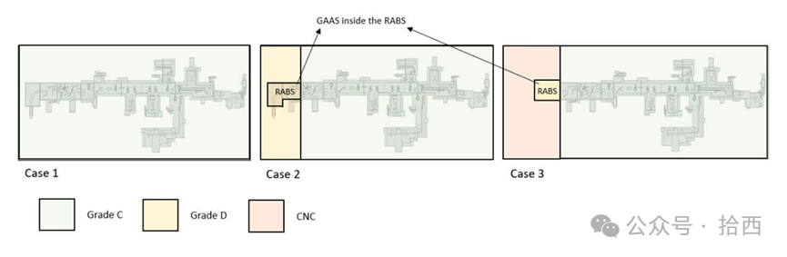 在一些场所,该策略完全消除了对D级区域的需求,直接从CNC区域开始巢盒或托盘的转移(案例3)。在这种设置中,巢盒通过RABS从CNC移动到C级区域,RABS作为受控的转移区,在此进行净化。在这种情况下,RABS的位置与C级房间的气流方向一致,形成一道保护屏障,限制CNC的空气渗透。