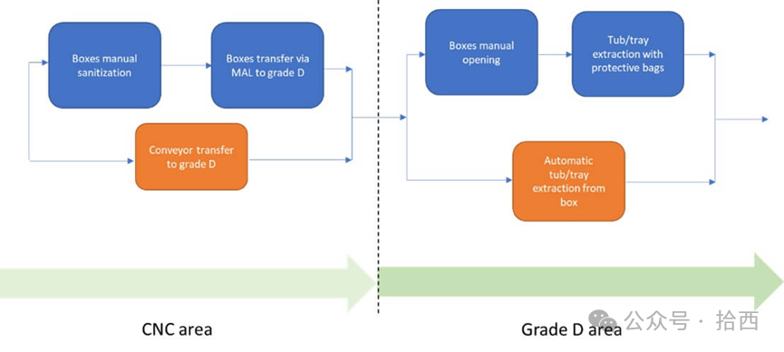 降低设施成本: D 级区域所需的环境控制比 C 级区域宽松,因此与“全 C 级”配置相比,其建设和运营成本更低。 增强物流灵活性:在初始处理阶段使用D级材料可以方便地转移巢盒或托盘,省去了在洁净室之间使用MAL进行转移的麻烦。此外,D级区域通常更易于进入,物料流动和操作员穿戴防护服也更加便捷。