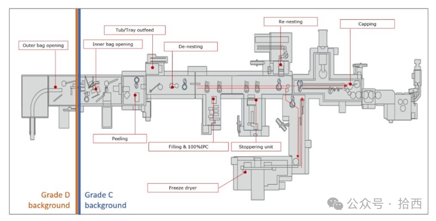 或者,可以只维护“无菌核心”,即发生无菌工艺过程的 A 级隔离区域,在 C 级背景中,同时将初始脱袋阶段或生产线引入点定位在 D 级(情况 2)。