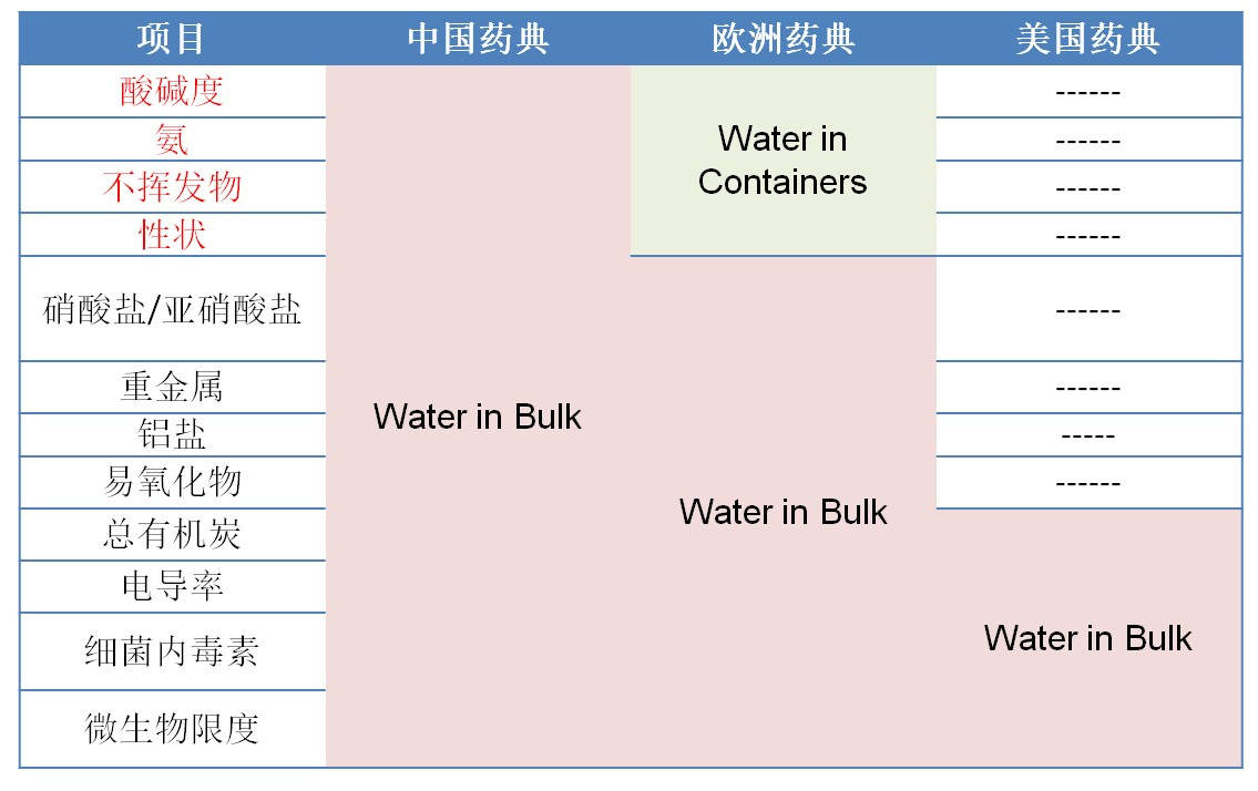 微生物:中国药典:纯化水和注射用水检验项目 表4-1最后一项 微生物限度:需氧菌总睡≤100CFU/cm